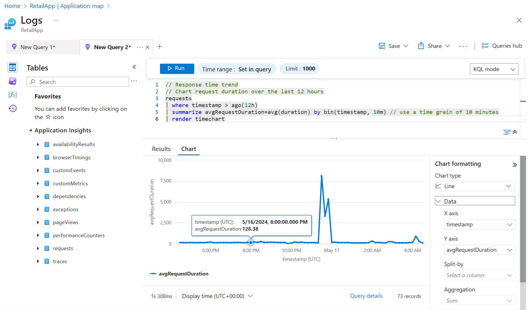The Logs (Analytics) page provides options to explore your application telemetry table records with built-in or custom queries and functions. You can work with the data by adjusting the format, and saving and exporting your analysis: